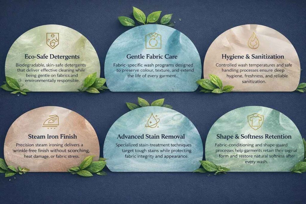 We use biodegradable detergents, water-efficient wash cycles, energy-smart drying, and fabric-preserving processes.