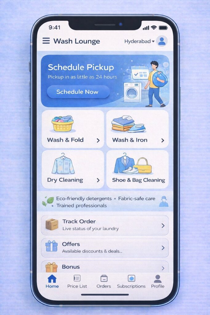 Wash Lounge offers eco-friendly laundry, premium dry cleaning, steam ironing, saree and delicate fabric care, leather bag cleaning, shoe cleaning, curtain cleaning, and home linen and household wash services.